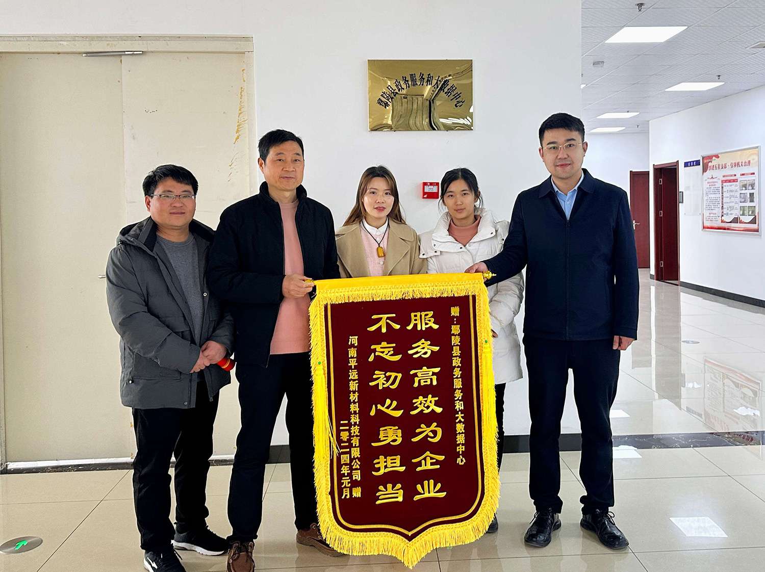 2024年1月11日至12日,河南平遠新材料科技有限公司總經(jīng)理黃恩明先生、品牌總監(jiān)黃茂女士等代表將八面飽含真摯謝意的錦旗分別贈給鄢陵縣先進制造業(yè)開發(fā)區(qū)管理委員會、縣政務(wù)服務(wù)中心市場監(jiān)督窗口、許昌市生態(tài)環(huán)境局鄢陵分局窗口、商務(wù)局、科技與工業(yè)信息化局、政務(wù)服務(wù)和大數(shù)據(jù)中心、發(fā)展和改革委員會窗口、國家稅務(wù)總局鄢陵縣稅務(wù)局窗口,對政府相關(guān)部門在公司落戶鄢陵的過程中給予的傾心服務(wù)和大力支持表示衷心感謝。